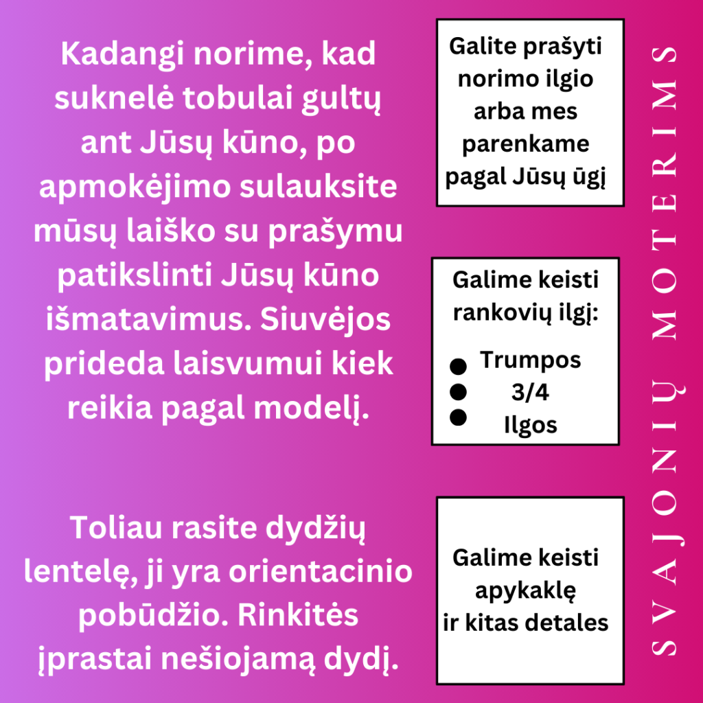 Mes siuvame kiekvieną modelį individualiai – pagal Tavo išmatavimus. Galime koreguoti ilgį, apykaklę, liemenį ar rankoves – kad suknelė ne tik gražiai atrodytų, bet ir idealiai priglustų. Nes Tu esi unikali – kaip ir tavo suknelė.